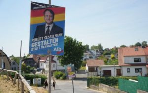 An election campaign poster shows Robert Sesselmann of the far-right Alternative for Germany (AfD), the candidate who won a vote on Sunday to become a district leader in Europe’s biggest economy for the first time, a breakthrough for the party which has hit record highs in national polls, in Sonneberg, Germany, June 26, 2023. Reuters/Max Schwarz