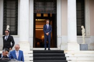 Newly sworn-in Greek Prime Minister Kyriakos Mitsotakis stands as outgoing caretaker Prime Minister Ioannis Sarmas leaves following a handover ceremony at the Maximos Mansion in Athens, Greece, June 26, 2023. REUTERS/Stoyan Nenov