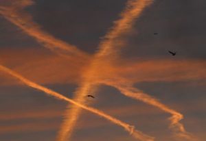 FILE PHOTO: Seagulls fly past aircraft contrails lit up by the dawn light over London, Britain, January 30, 2018. REUTERS/Toby Melville