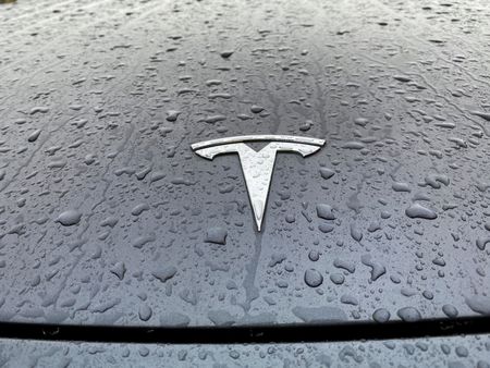 FILE PHOTO: A view shows the Tesla logo on the hood of a car in Oslo
