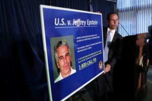 FILE PHOTO: An employee of the Southern District of New York hangs a sign containing a photograph of Jeffrey Epstein, charged of sex trafficking of minors and conspiracy to commit sex trafficking of minors, in New York, U.S., July 8, 2019. REUTERS/Shannon Stapleton/File Photo