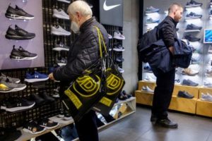 FILE PHOTO: A shopper carrying JD Sports bags looks at footwear at a JD Sports store in London, Britain, November 17, 2021. REUTERS/May James