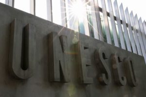 A UNESCO sign is seen at the UNESCO headquarters, on the day of the opening of the second session of negotiations around a future treaty on tackling plastic pollution, in Paris, France, May 29, 2023. REUTERS/Stephanie Lecocq