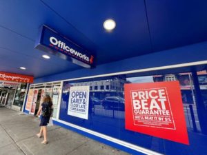 FILE PHOTO: A woman walks past an Officeworks store, part of the Wesfarmers retail conglomerate, in Sydney, Australia February 17, 2022. REUTERS/Stephen Coates/File Photo