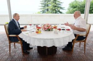 FILE PHOTO: Russian President Vladimir Putin meets with Belarusian President Alexander Lukashenko at the Bocharov Ruchei residence in Sochi, Russia June 9, 2023. Sputnik/Gavriil Grigorov/Kremlin via REUTERS ATTENTION EDITORS – THIS IMAGE WAS PROVIDED BY A THIRD PARTY./File Photo