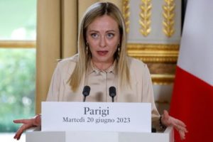 FILE PHOTO: Italy’s Prime Minister Giorgia Meloni delivers remarks after arriving for a meeting with France’s President Emmanuel Macron at the Elysee Palace in Paris, France, on June 20, 2023. LUDOVIC MARIN/Pool via REUTERS