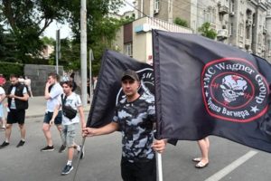 FILE PHOTO: A supporter of Wagner private mercenary group holds flags near the headquarters of the Southern Military District controlled by Wagner fighters in the city of Rostov-on-Don, Russia, June 24, 2023. REUTERS/Stringer/File Photo