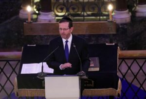Israeli President Isaac Herzog takes part in the commemoration of the 80th anniversary of the Warsaw Ghetto Uprising, at the Nozyk Synagogue in Warsaw, Poland, April 19, 2023. REUTERS/Aleksandra Szmigiel/File photo