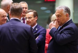 German Chancellor Olaf Scholz, Swedish Prime Minister Ulf Kristersson and Hungarian Prime Minister Viktor Orban attend the European Union leaders summit in Brussels, Belgium June 29, 2023. REUTERS/Johanna Geron