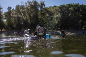 Children refresh themselves at the Feather River, as the temperature rises over 100 degrees Fahrenheit (38 Celsius), in Yuba City, California, U.S., June 30, 2023. REUTERS/Carlos Barria