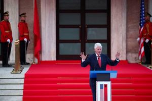 Former U.S. president Bill Clinton delivers his speech during a welcoming in Tirana, Albania, July 3, 2023. REUTERS/Florion Goga