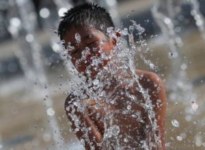A child cools off in a fountain during a period of high temperatures, at the Monument to the Revolution in Mexico City, Mexico June 22, 2023. REUTERS/Henry Romero