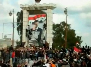 FILE PHOTO: This still image taken from amateur video shows protesters defacing a giant poster of Syria’s President Bashar al-Assad in Deraa, Syria March 25, 2011. Footage taken March 25, 2011. There was no way to independently verify the contents of the videos. REUTERS/Amateur Video via Reuters TV/File Photo