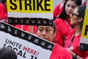 People protest in front of InterContinental Hotel as unionized hotel workers in Los Angeles and Orange County go on strike, in Los Angeles, California, U.S. July 2, 2023. REUTERS/David Swanson