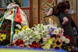 Friends of prominent Ukrainian writer Victoria Amelina, who died in a hospital after she was injured by a Russian missile strike in the city of Kramatorsk, react during a funeral ceremony, amid Russia’s attack on Ukraine, in Kyiv, Ukraine July 4, 2023. REUTERS/Alina Smutko TPX IMAGES OF THE DAY