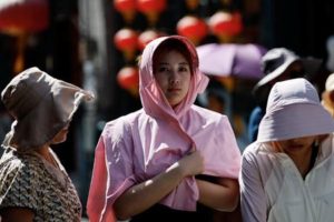 People wearing sun protection gear walk on a street, amid a red alert for heatwave in Beijing, China July 6, 2023. REUTERS/Tingshu Wang