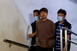 Political activist Ivan Lam Long-yin is arrested by national security police in Hong Kong on suspicion of conspiracy to collude with foreign forces and acts with seditious intent, two days after the police issued arrest warrants and bounties against eight overseas activists for national security, in Hong Kong, China July 5, 2023. REUTERS/Tyrone Siu