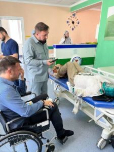 Human Rights Commissioner in the Chechen Republic Mansur Soltaev visits Yelena Milashina, a journalist for the now-banned independent newspaper Novaya Gazeta, and lawyer Alexander Nemov in hospital after they were attacked on their way to the Chechen capital Grozny from the local airport, in Grozny, Russia July 4, 2023. Crew Against Torture/Handout via REUTERS