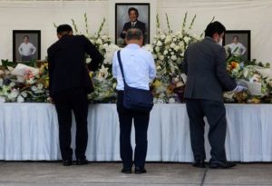 Portrait photos of late Japanese Prime Minister Shinzo Abe, who was shot while campaigning for a parliamentary election in 2022, are placed on an altar as mourners offer flowers and prayers for Abe during the one year commemoration ceremony of his assassination at Zojoji temple in Tokyo, Japan July 8, 2023. REUTERS/Issei Kato