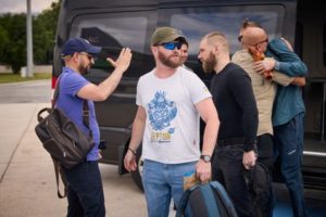 Commanders of defenders of the Azovstal Iron and Steel Works in Mariupol Sviatoslav Palamar, Serhii Volynskyi and Denys Prokopenko arrive to an airport as they return to Ukraine from Istanbul, Turkey July 8, 2023. Ukrainian Presidential Press Service/Handout via REUTERS
