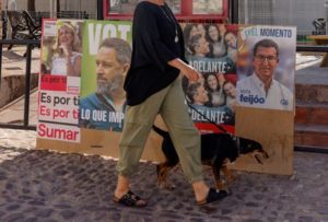 FILE PHOTO: A woman with her dog walks past electoral posters of Spain’s left-wing Sumar leader Yolanda Diaz, Spain’s far-right Vox party leader Santiago Abascal, Spain’s acting Prime Minister and Socialist leader Pedro Sanchez and Spanish opposition People’s Party leader Alberto Nunez Feijoo, ahead of the July 23 snap election, in Ronda, Spain July 7, 2023. REUTERS/Jon Nazca/File Photo