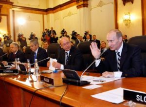 FILE PHOTO: Russian President Vladimir Putin (R) speaks during the meeting of the NATO-Russia Council in the Palace of the Parliament at the NATO Summit in Bucharest April 4, 2008. REUTERS/Pool/File Photo