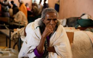 Birhan Gebremedhin, 65, displaced due to the fighting between the Tigray People’s Liberation Front (TPLF) Forces and Ethiopian National Defence Force (ENDF) allied with Amhara Special Force, sits next to her belongings at the Abi Adi camp for the Internally Displaced Persons in Abi Adi, Tigray Region, Ethiopia, June 24, 2023. REUTERS/Tiksa Negeri