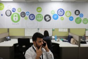 A man talks on the phone at Deloitte’s office in Gurugram, India, June 13, 2023. REUTERS/Anushree Fadnavis
