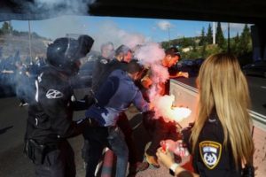 Members of security forces clash with a protestor holding a flare, during a protest against Israeli Prime Minister Benjamin Netanyahu and his nationalist coalition government’s judicial overhaul, on a highway to Jerusalem on ‘Day of Paralysis’ , July 11, 2023. REUTERS/Ronen Zvulun