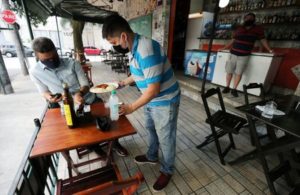 FILE PHOTO: A waiter serves a customer at a bar after the reopening of gyms, restaurants and sport facilities on the beaches as the city eases restrictions, amid the coronavirus disease (COVID-19) outbreak in Rio de Janeiro, Brazil July 2, 2020. REUTERS/Sergio Moraes
