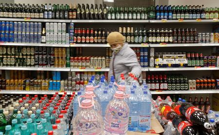 A customer walks past shelves with bottles and cans of beer in a supermarket in Moscow