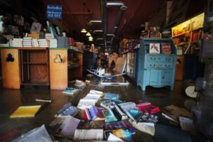 Books lie damaged on the floor of Bear Pond Books after flooding from recent rain storms in Montpelier, Vermont, U.S., July 11, 2023. REUTERS/Brian Snyder