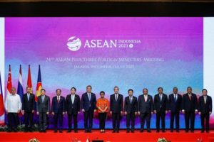 Philippine’s Foreign Secretary Enrique Manalo, Singapore’s Foreign Minister Vivian Balakrishnan, Thailand’s SOM Leader Sarun Charoensuwan, Vietnam’s Foreign Minister Bui Thanh Son, Japan’s Foreign Minister Yoshimasa Hayashi, South Korea’s Foreign Minister Park Jin, Indonesia’s Foreign Minister Retno Marsudi, China’s Communist Party’s foreign policy chief Wang Yi, Laos Foreign Minister Saleumxay Kommasith, Brunei’s Second Minister of Foreign Affair Erywan Yusof, Cambodia’s Foreign Minister Prak Sokhonn, Malaysia’s Foreign Minister Zambry Abdul Kadir, East Timor’s Foreign Minister Bendito Freitas and ASEAN Secretary General Kao Kim Hourn pose for a group photo during the Association of Southeast Asian Nations (ASEAN) Plus Three Foreign Ministers’ Meeting in Jakarta, Indonesia, 13 July 2023. MAST IRHAM/Pool via REUTERS