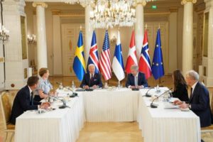 U.S. President Joe Biden attends a U.S.-Nordic Leaders meeting with Finland’s President Sauli Niinisto, Denmark’s Prime Minister Mette Frederiksen, Sweden’s Prime Minister Ulf Kristersson, Norway’s Prime Minister Jonas Gahr Store and Iceland’s Prime Minister Katrin Jakobsdottir in Helsinki, Finland, July 13, 2023. REUTERS/Kevin Lamarque