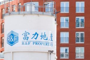 FILE PHOTO: The logo of developer R&F Properties is seen near the One Thames City construction site at Nine Elms, in London, Britain, October 6, 2021. REUTERS/John Sibley