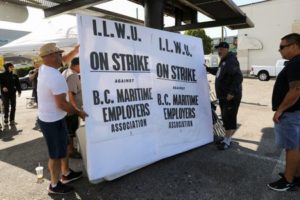 Union members with the International Longshore and Warehouse Union Canada (ILWU) remove strike signs from a picket line outside the despatch hall in Vancouver, British Columbia, Canada July 13, 2023. REUTERS/Chris Helgren