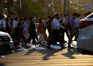 FILE PHOTO: Office workers wearing protective face masks walk to head home at sunset amid the coronavirus disease (COVID-19) outbreak, in Tokyo, Japan June 9, 2020. REUTERS/Issei Kato