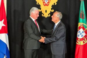 Cuba’s President Miguel Diaz-Canel and Portugal’s President Marcelo Rebelo de Sousa shake hands at the Belem Palace, in Lisbon, Portugal, July 14, 2023. REUTERS/Miguel Pereira