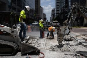 Men work on the light-rail line during hot weather in downtown Houston, Texas, U.S., July 14, 2023. REUTERS/Adrees Latif