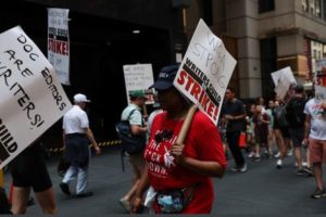 Striking Writers Guild of America (WGA) members walk the picket line as SAG-AFTRA union announced it had agreed to a ‘last-minute request’ by the Alliance of Motion Picture and Television Producers for federal mediation, but it refused to again extend its existing labor contract past the 11:59 p.m. Wednesday negotiating deadline, in New York City, U.S., July 12, 2023. REUTERS/Shannon Stapleton