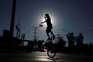 FILE PHOTO: A street artist performs in an avenue under the intense heat as the temperature reaches 122 degrees Fahrenheit (50 Celsius), in Mexicali, Baja California state, Mexico July 2, 2023. REUTERS/Victor Medina/File Photo