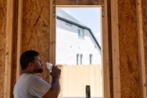 Luis Hernandez, a builder from Mexico, takes a lunch break inside a house under construction during hot weather in Manvel, Texas, U.S., July 13, 2023. REUTERS/Adrees Latif