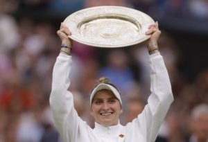 Tennis – Wimbledon – All England Lawn Tennis and Croquet Club, London, Britain – July 15, 2023 Czech Republic’s Marketa Vondrousova celebrates with the trophy winning her final match against Tunisia’s Ons Jabeur REUTERS/Andrew Couldridge