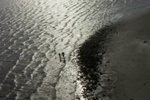 A father and child walk the shoreline searching for shells during hot weather in Texas City, Texas, U.S., July 15, 2023. REUTERS/Adrees Latif