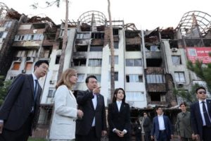 South Korean President Yoon Suk Yeol and first lady Kim Keon Hee visit the town of Irpin, heavily damaged during Russia’s attack on Ukraine, outside of Kyiv, Ukraine July 15, 2023. The Presidential Office/Yonhap via REUTERS