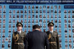 South Korean President Yoon Suk Yeol visits the Wall of Remembrance to pay tribute to killed Ukrainian soldiers, amid Russia’s attack on Ukraine, in Kyiv, Ukraine July 15, 2023. The Presidential Office/Yonhap via REUTERS