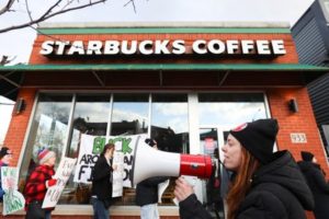 Starbucks workers attend a rally as they go on a one-day strike outside a store in Buffalo, New York, U.S., November 17, 2022. REUTERS/Lindsay DeDario