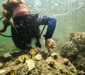 NOAA intern and University of Miami PhD candidate, Allyson DeMerlis, grabbles samples of corals that she planted in December of 2022 that have now already bleached fully in Miami, Flordia, U.S., July 14, 2023. REUTERS/Maria Alejandra Cardona