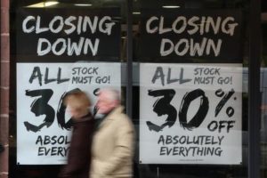 FILE PHOTO: People walk past a shop with closing down signs in the window in Chester, Britain, November 17, 2022. REUTERS/Phil Noble