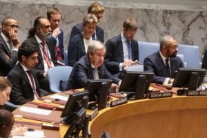U.N. Secretary-General Antonio Guterres speaks to the U.N. Security Council during a meeting on Artificial intelligence at U.N. headquarters in New York City, U.S., July 18, 2023. REUTERS/Brendan McDermid